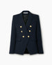 A tailored essential, this double-breasted blazer is cut from midnight-blue grain de poudre for a polished, versatile look. Structured shoulders balance the nipped-in waist, creating a slim, flattering silhouette that transitions seamlessly from office to evening.