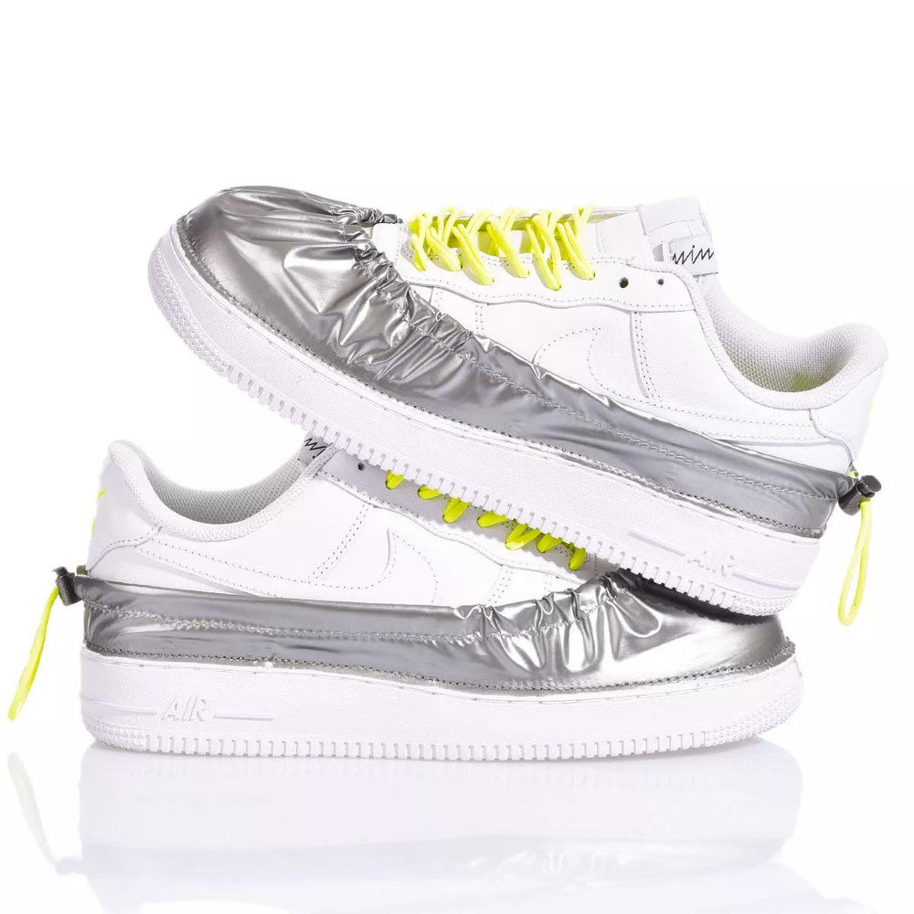 Nike Air Force 1 Silver Parachute is the super modern and trendy custom sneaker for both men and women. Semi-covered in silver nylon with fluorescent yellow drawstrings and nickel stoppers, and the Nike logo embroidered on the back in the same fluorescent yellow as the double laces.