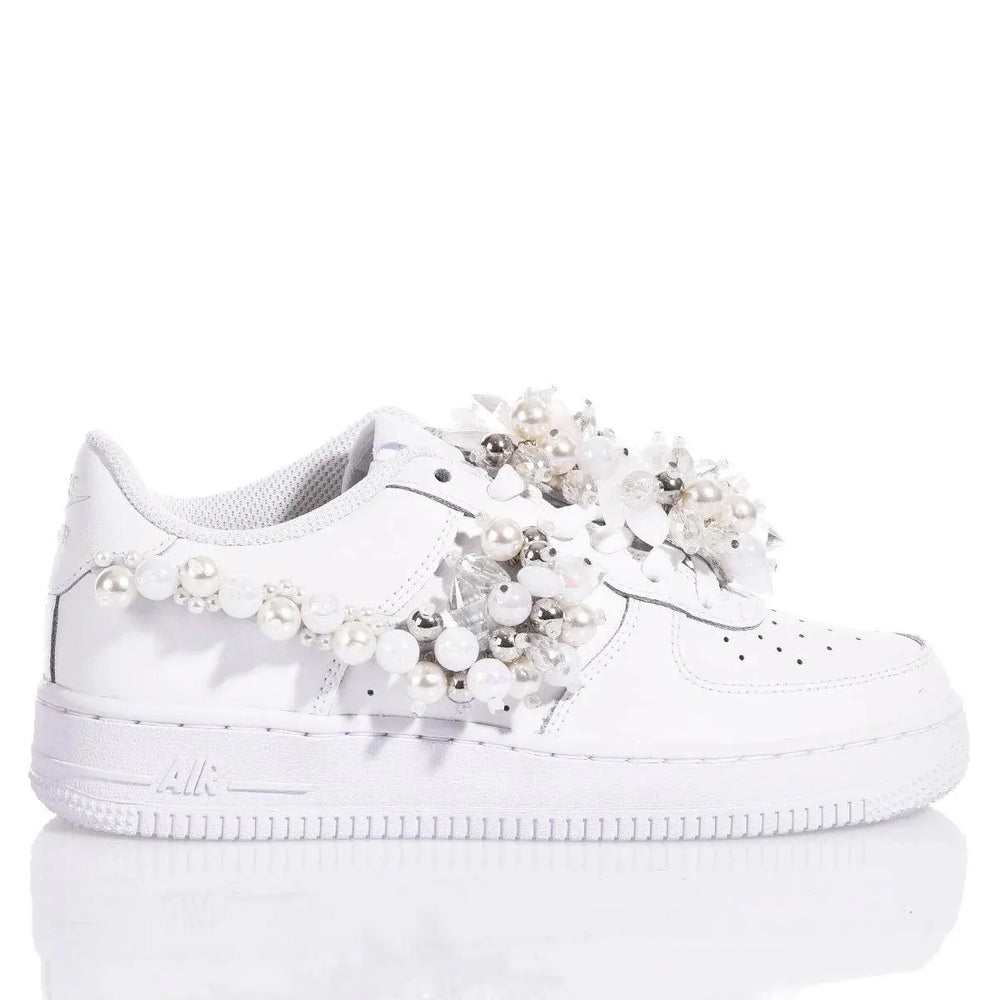 Nike Air Force 1 White Ice è la sneakers che unisce delicatezza e lusso in un design unico. Il vero punto forte è il gioiello rimovibile con perle e pietre sulla parte dell'allacciatura, che dona un tocco di raffinatezza e brillantezza. L'iconico swoosh, anch'esso arricchito da un'applicazione gioiello con perle e pietre, aggiunge un ulteriore accento di eleganza e luce. Il risultato è un look scintillante e sofisticato, che non passa inosservato, perfetto per chi cerca una sneakers che esprima stile, lusso e unicità in ogni dettaglio.